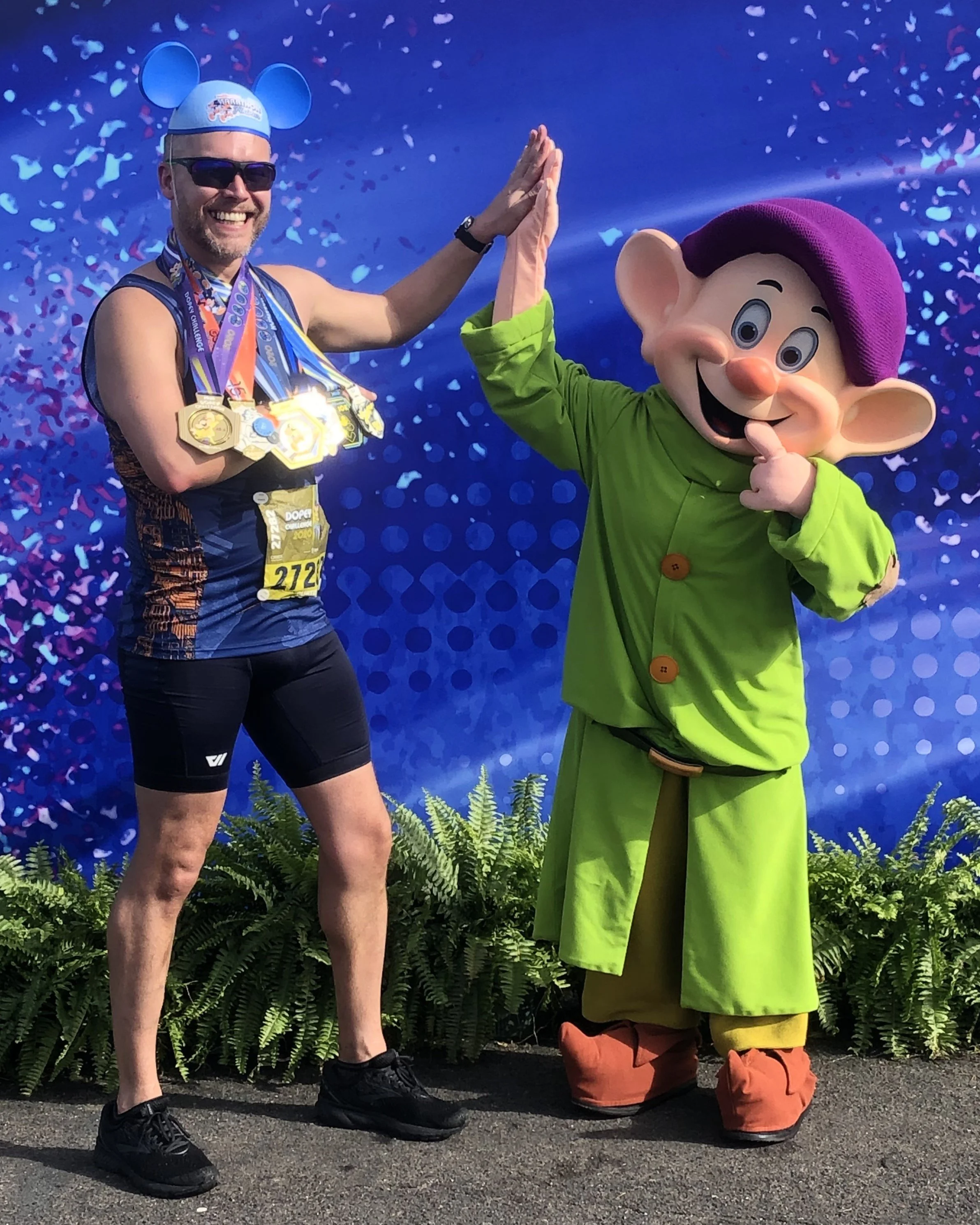 Give me a challenge and I will meet it! I started running in the summer of 2013 and I found a community in Front Runners New York, where I became heavily involved. Since I started long-distance racing in 2015, I have completed countless half marathons, 12 full marathons, and even a full Ironman Triathlon (that’s 140.6 miles for those not in the know). This picture is from the Dopey Challenge at Disney world, where you run a 5K, 10K, Half Marathon, and Full Marathon in the span of four days. The Disney Races are my favorite!